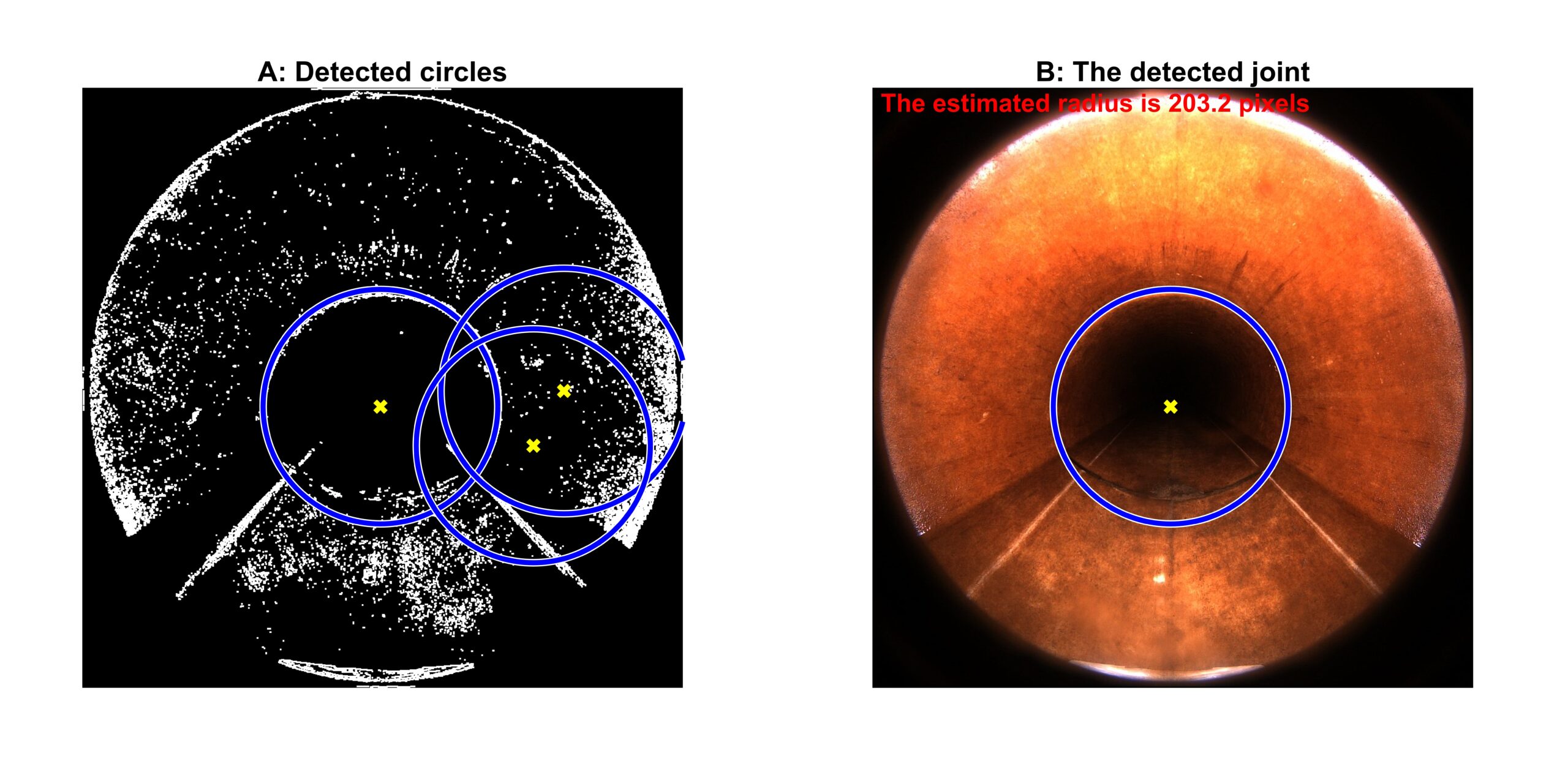 In Figure 1D, several lines can be distinguished, such as the circle marking the connection, as well as the diagonal lines representing the track left by the inspection robot. To enable a computer to detect only the connection, an algorithm is then applied to the dilated edges that is ideally suited for detecting circular patterns: the “Circular Hough Transform” (CHT). Figure 2A shows which circles the algorithm was able to identify in the previous steps. To remove the irrelevant circles, as a final step in the algorithm, a filter is added to exclude those whose centres are not at the centre of the image. Thus, only the circle corresponding to the connection remains, as shown in Figure 2B.